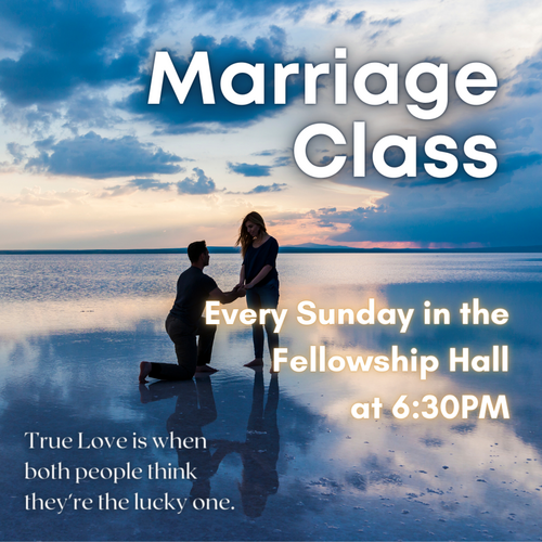 Marriage class is every Sunday night starting at 6:30 pm in the fellowship hall.